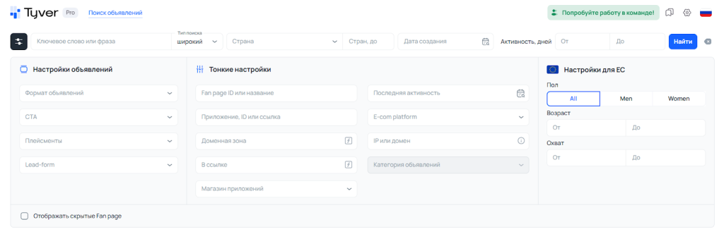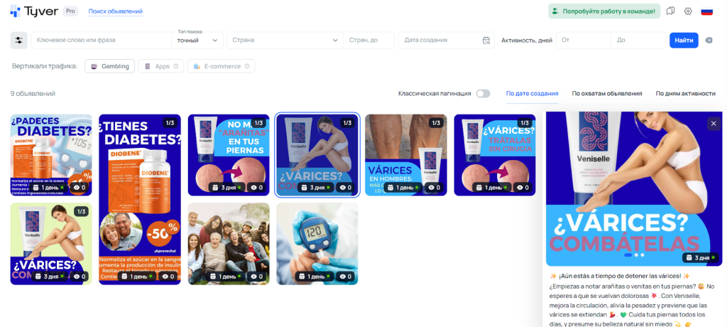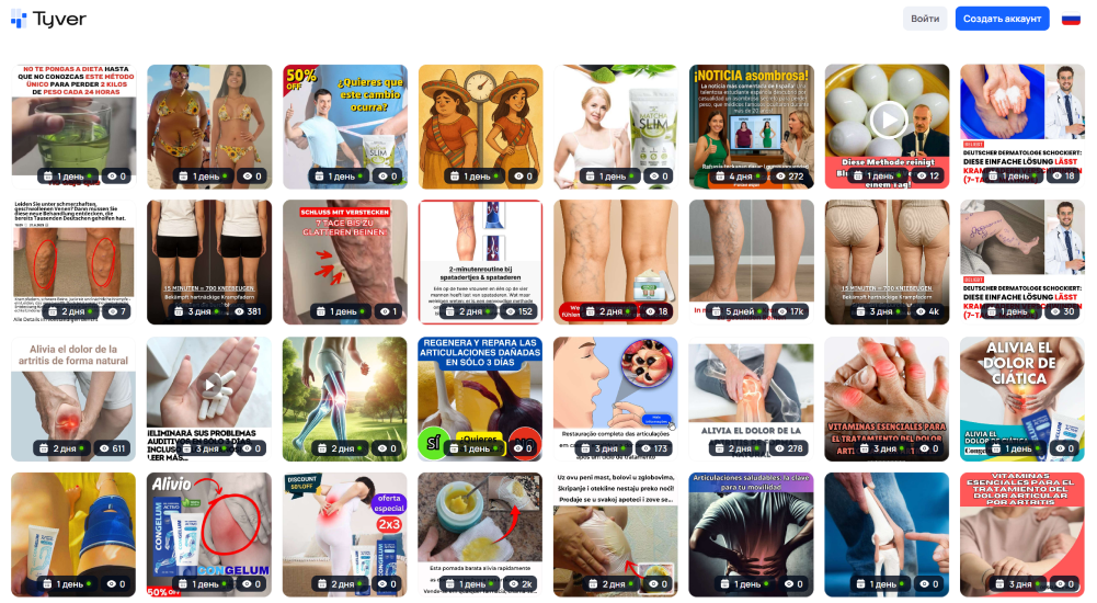 Surpreendentemente, não há necessidade de recorrer a ferramentas de marketing complexas aqui — uma simples espionagem dos anúncios dos concorrentes será suficiente. O segredo é saber como usar os serviços de espionagem e quais funcionalidades eles oferecem. Vamos explorar isso com exemplos específicos usando o serviço de espionagem Tyver e algumas ofertas da AdCombo.
