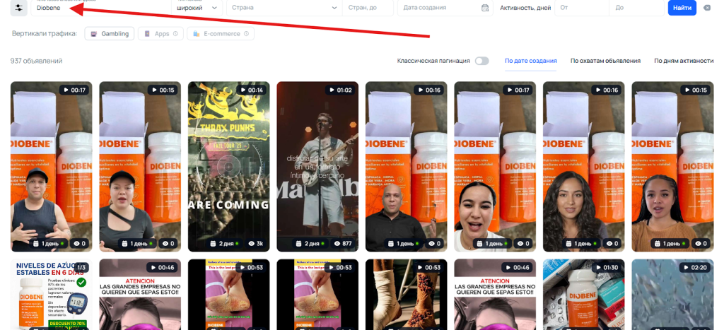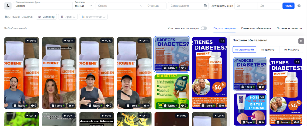 Primeiro, você precisa encontrar o máximo de anúncios possível que ajudem você a criar seus próprios anúncios. Vamos analisar a busca criativa usando ofertas como exemplo. Diobene e Niapept são medicamentos para diabetes e tratamentos antienvelhecimento, respectivamente. Pesquise anúncios pelo nome da oferta e por quaisquer palavras-chave relacionadas ao nicho.
