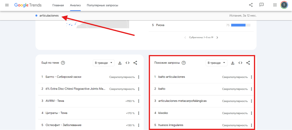 Encontrar palavras-chave para espionagem usando o Google Trends e chats de IA. No Trends, você pode encontrar as palavras-chave necessárias na seção «Consultas relacionadas «.