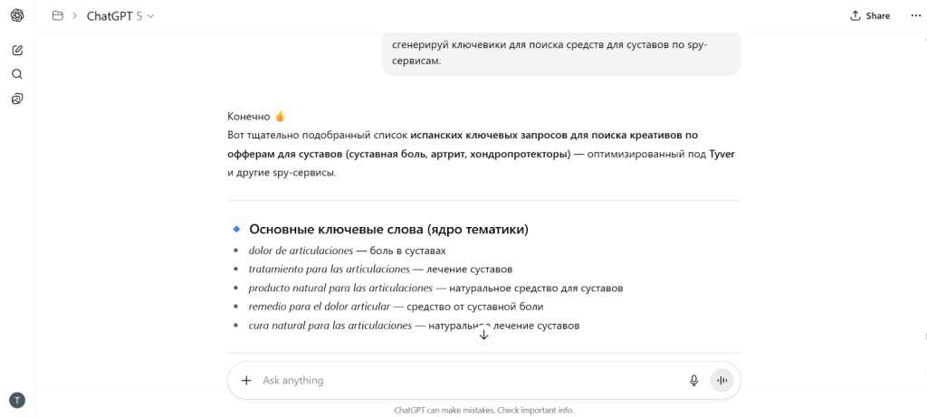 Com chats de IA, é ainda mais simples: você só precisa solicitar uma lista de palavras-chave no idioma desejado, e o sistema os gerará. Vamos usar o ChatGPT como exemplo (você pode usar o Grok ou o Gemini).