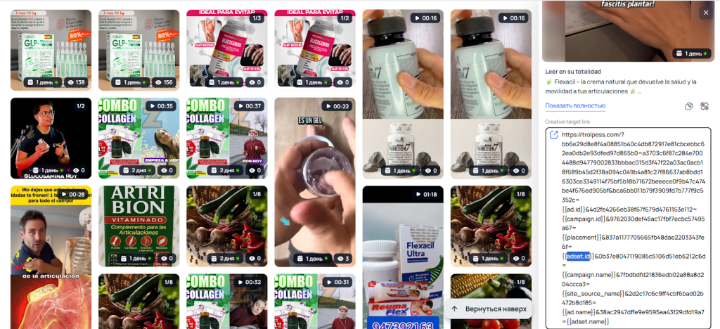 Filtramos os resultados da pesquisa adicionando os identificadores sub e adset.id. Como resultado, o número de anúncios nos resultados da pesquisa caiu drasticamente, mas agora a grande maioria dos anúncios pertence a profissionais de marketing afiliados.